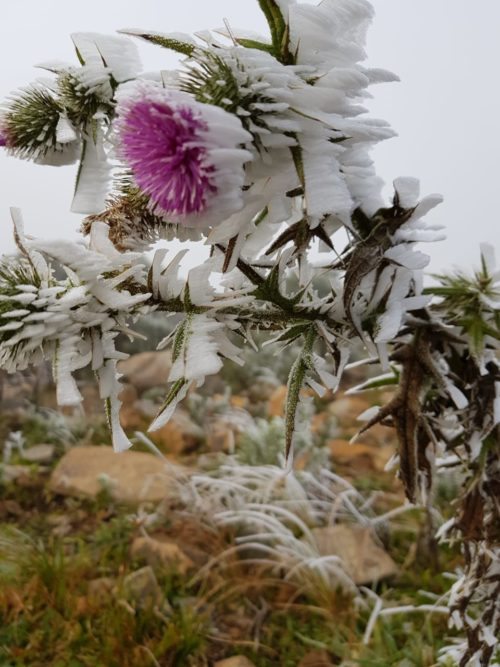 Imagem captada no Morro das Antenas, em Urupema. Uma flor completamente congelada.