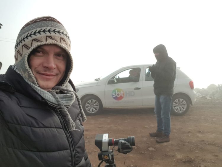 O moço da Imagem TV. Rainwald Muller decidiu madrugar e viajar até Urupema para registrar a ocorrência do frio. Conseguiu fazer belas imagens, juntamente com outros colegas de TV como a NSC e SBT TV.