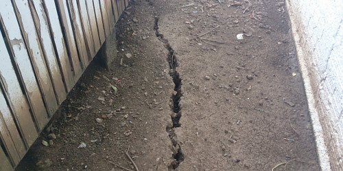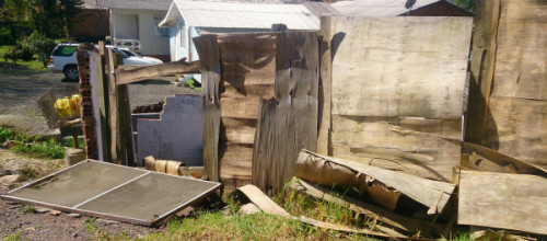 Acontece que quando chove acumula água e o solo não suporta, visto que o muro não caiu ainda por sorte, porque já está bem torto, os tapumes estão podres, destruídos e nada é feito.