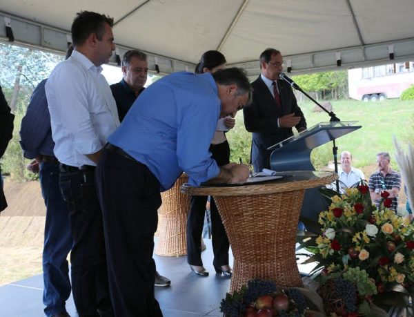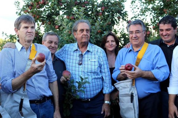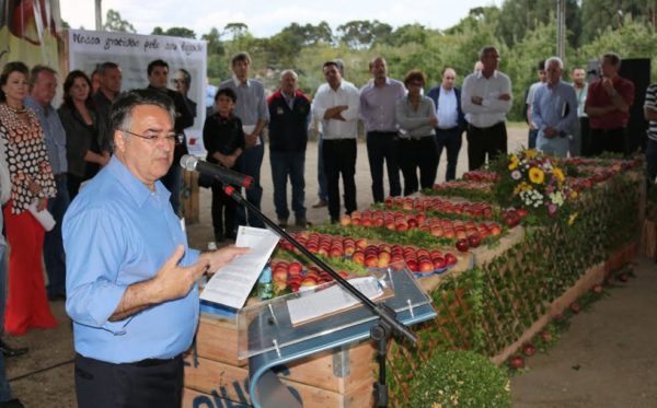 Acompanhado de prefeitos, deputados e convidados, o governador colheu maçãs e recebeu de presente uma caixa de frutas gigantes de um produtor.