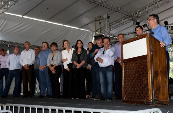 Na plateia diante do palco principal da Festa das Hortaliças, faixas reforçavam o pedidos dos prefeitos pela rodovia.