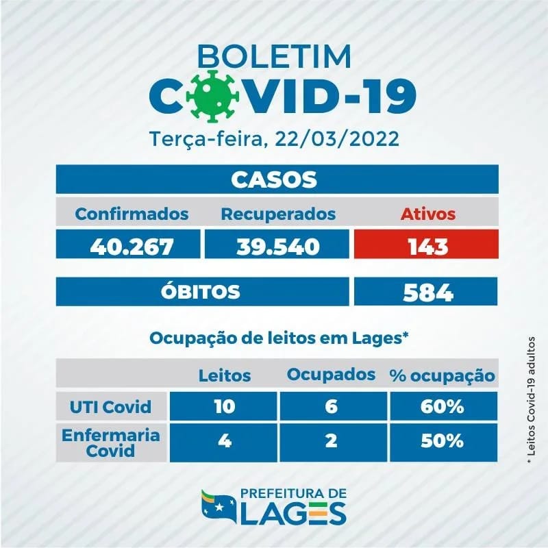 A lamentar o registro de mais um óbito em razão do coronavírus. Lages chega agora ao número de 584 vítimas. Por outro lado, os casos ativos seguem em queda. Por hora, segundo o Boletim desta terça-feira (22), há 143, a partir dos dados. A UTI está com 60% de ocupação, e a enfermaria, 50%.